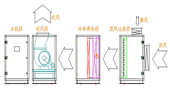 地下工程用除濕空調(diào)機(jī)采用模塊化設(shè)計(jì)理念和組合式結(jié)構(gòu),由混風(fēng)過(guò)濾段、冷卻再熱段、送風(fēng)段和主機(jī)段組合而成。自由拼裝,連接簡(jiǎn)單,拆卸方便。